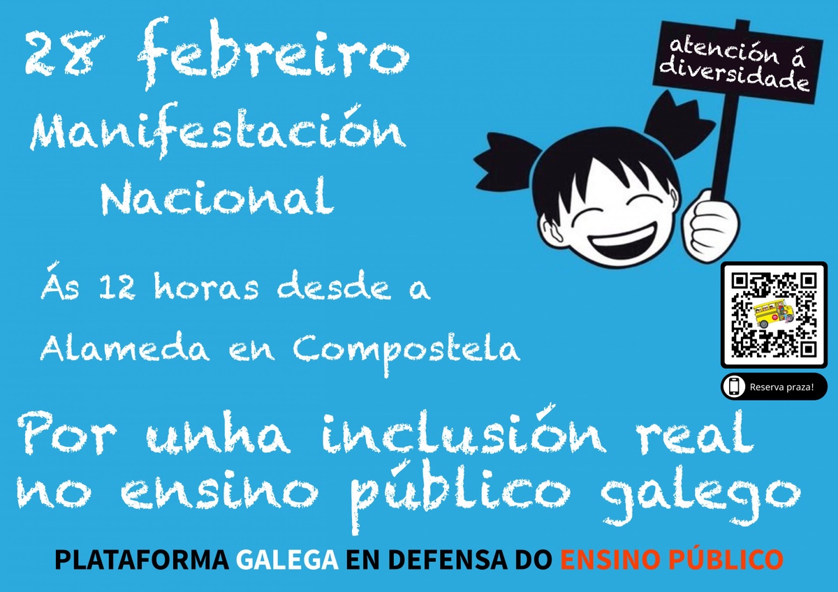 A Plataforma Galega en Defensa do Ensino Público convoca manifestación nacional o 28 en Compostela en demanda de medidas para atender a diversidade.